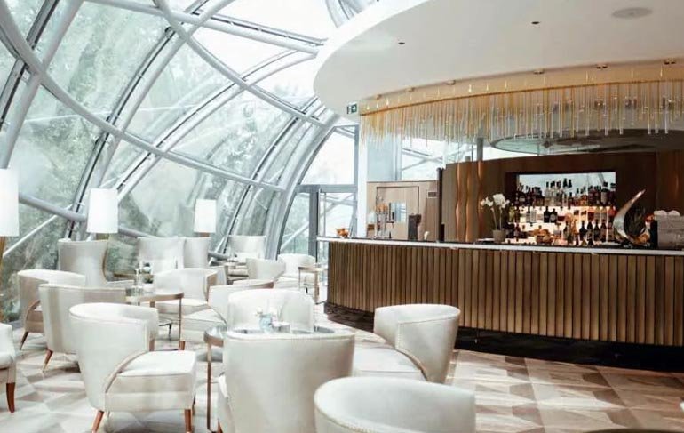 Die unter der neuen spektakulären Glaskuppel befindliche Apollo Bar und das Á-la-Carte-Restaurant „The Glass Garden“, in dem Küchenchef Markus Mayr auch für externe Besucher leidenschaftlich kocht und 2018 mit drei Hauben und 17 Punkten ausgezeichnet wurde, blicken die Gäste auf die Altstadt von Salzburg.